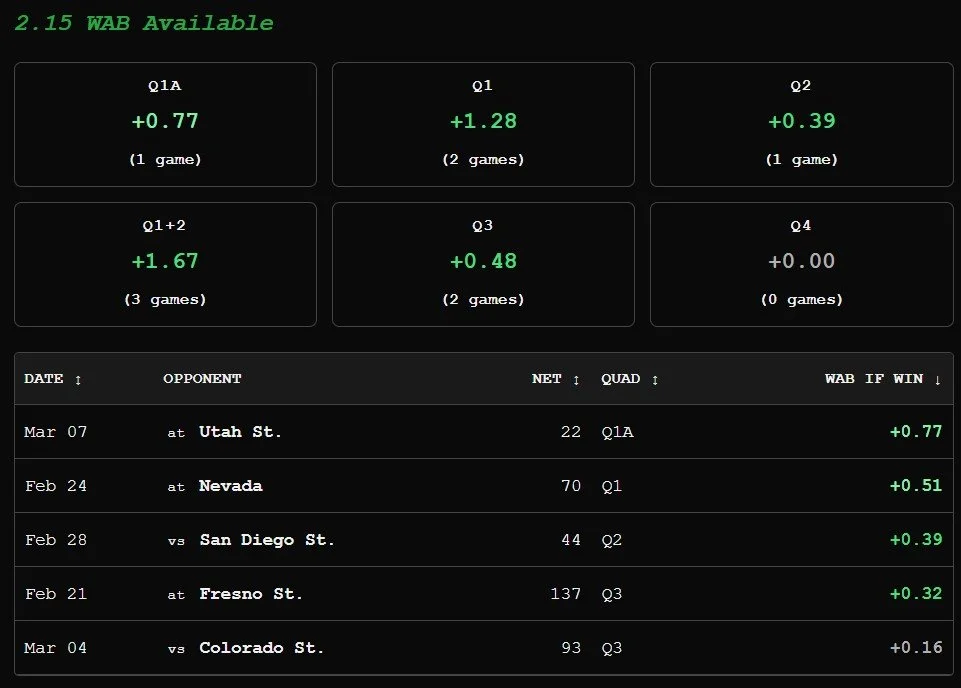 Of the five remaining games on UNM’s schedule, WAB projects that the Lobos can improve their total WAB by +2.15, which would put them #33 nationally (theoretically) if they win out.