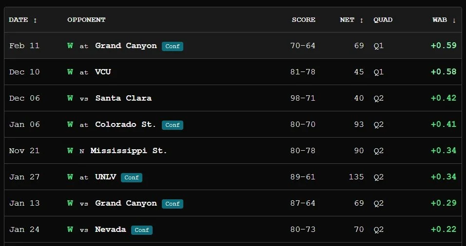 For example, New Mexico’s 70-64 win at GCU is worth +0.59 WAB - meaning that an average bubble team would only be expected to win that game 41% of the time. The WAB statistic accumulates throughout the season and ranks teams success rates.