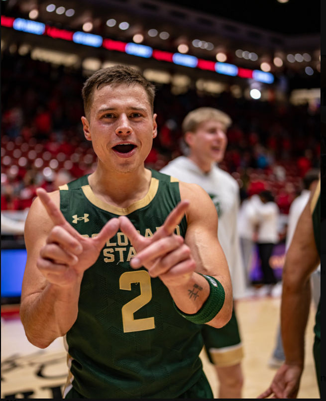 Junior guard Brendon Rechsteiner celebrates after Colorado State’s 82-74 win over UNM in the Pit on Wednesday. Photo: CSU Athletics