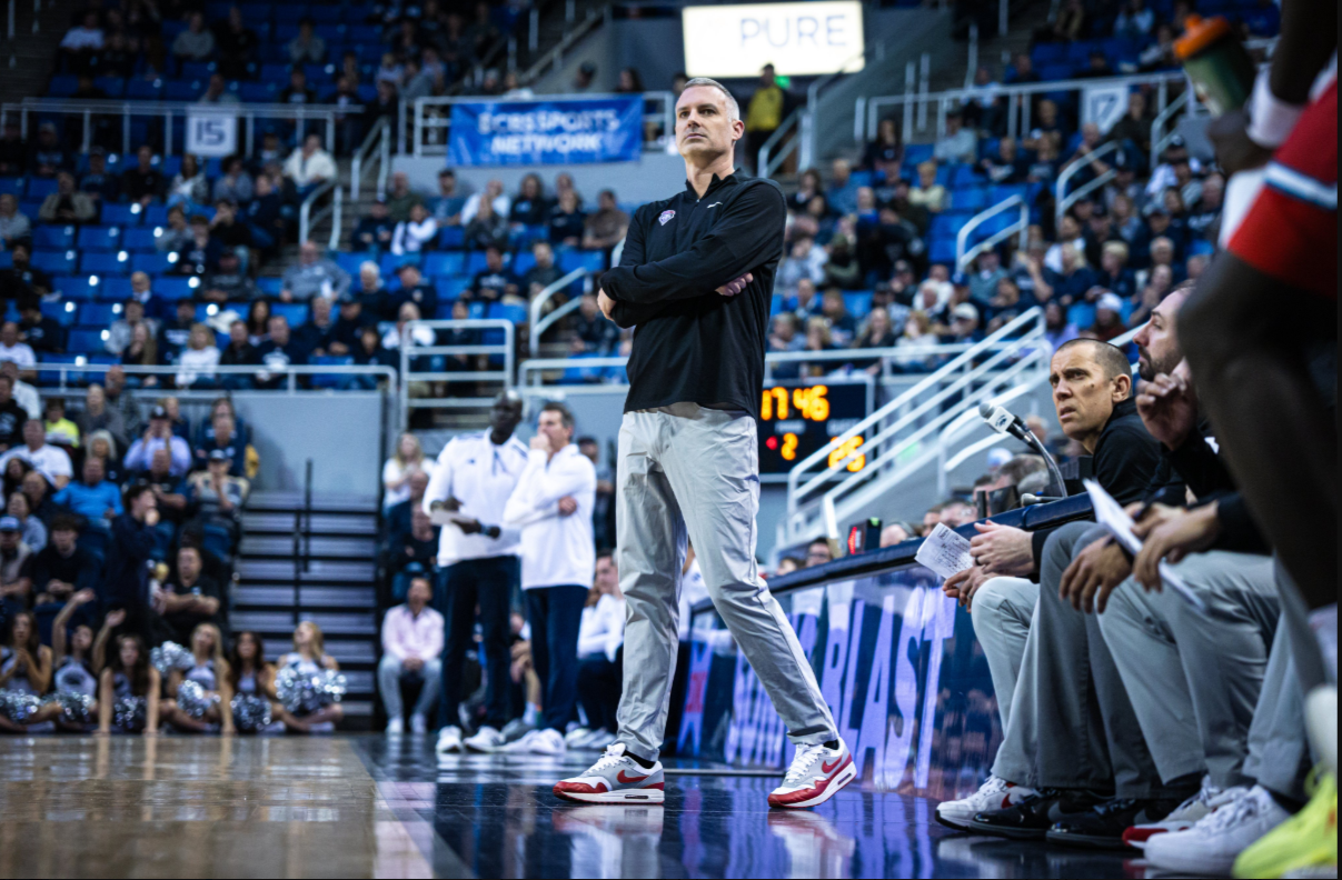UNM men’s basketball head coach Eric Olen looks from the sideline during UNM’s 67-60 loss to Nevada. Photo: UNM Athletics.