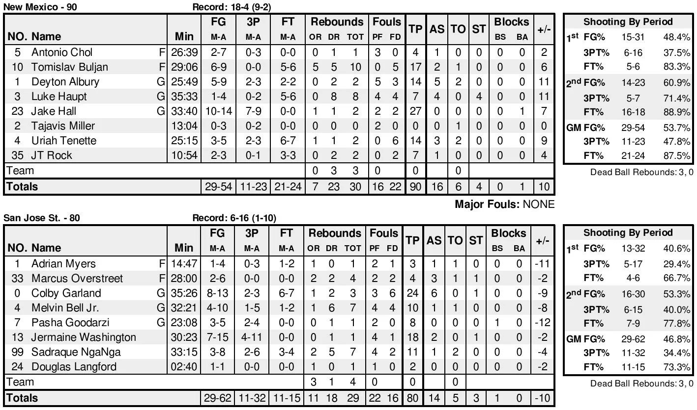 Coupled with Utah State's home win against San Diego State, the Lobos' 90-80 victory at lowly San Jose State created a three-way tie for first place in the Mountain West.