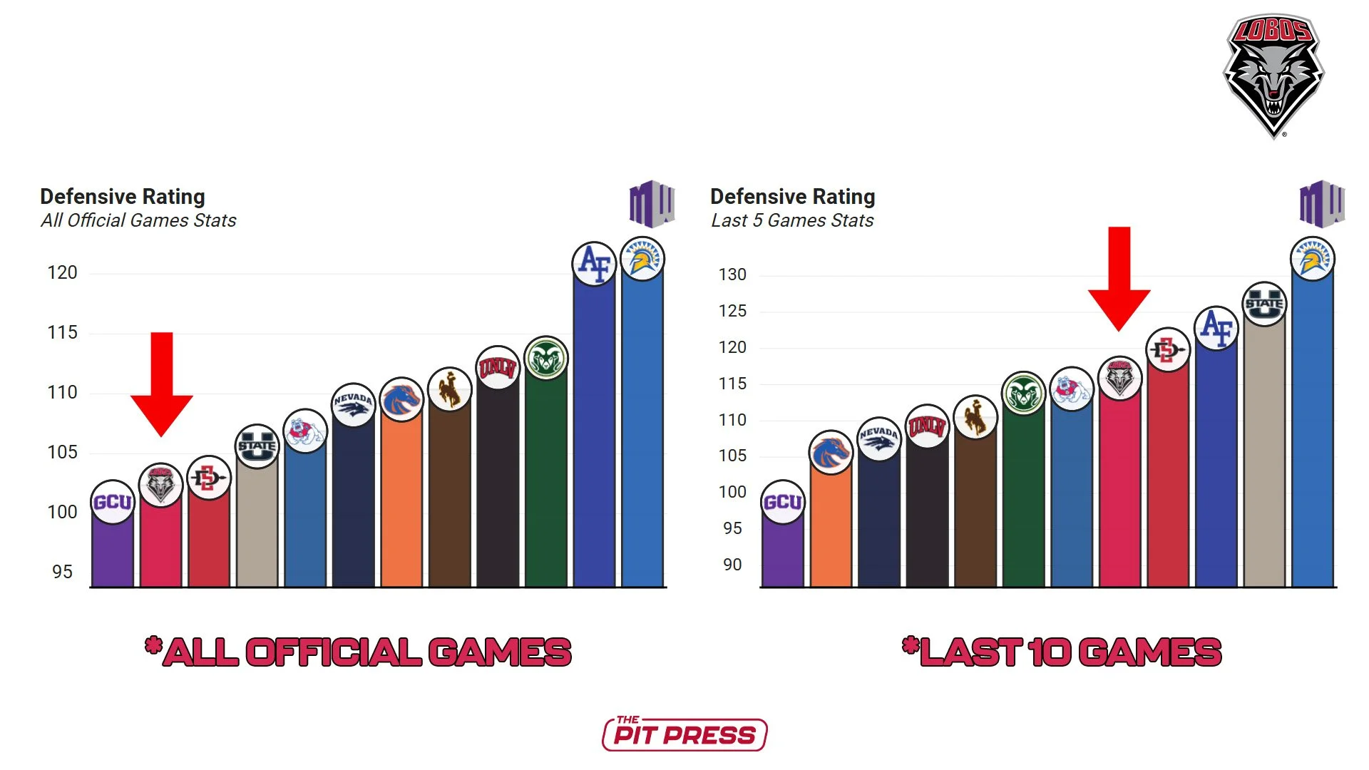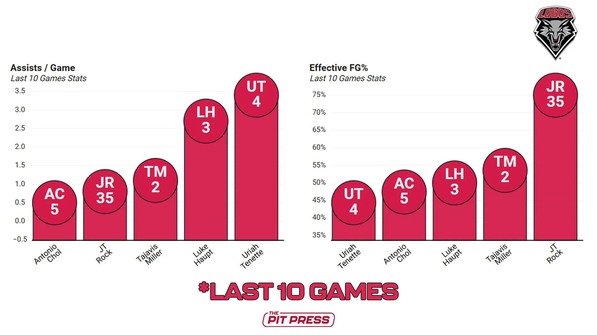 For most of the season, the Lobos have relied on their defense to disrupt opponents and create turnovers. Statistically, UNM is a top 40 team in Defensive Efficiency in Ken Pom, but the Lobos were a top 25 team through the first 10 games of the conference season. UNM has given up over 80 points four times over the last 10 games, including 94 and 86 points to Utah State, 91 points to Boise State, and 82 points to Colorado State. All of these teams have exposed UNM’s switching man-to-man defense and drop coverage in the pick-and-roll, and have cashed in on wide open 3-point shot attempts due to UNM having to over-help in the paint. In those four losses, teams are shooting a combined 39% from the 3-point line while also shooting a combined 122 free throws, showing that teams have been able to build leads and get to the free throw line against the Lobos. UNM needs to tighten up its pick-and-roll ball screen coverage to not allow crafty ball handlers to pick them apart and force help, and they need to locate shooters and close out quicker to prevent wide open 3-point shot attempts that have been their achilles heel through the second part of the conference season.