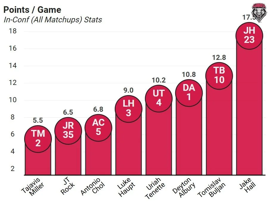 Lobo fans love when Jake Hall lights it up from long distance. The freshman has shattered the Mountain West Conference record books and has been UNM’s most consistent offensive player who ranks 7th in the MWC in 16.3 PPg and firstt in 3PT FG made at 99. But UNM is at its best when it gets three to four players, including Hall, in double figures. Who will it be in the Mountain West Conference Tournament? Buljan had a monster game against SDSU with 24 points and 18 rebounds and another double-double against Utah State, but he still struggles at the free throw line. Uriah Tenette, Deyton Albury, and Luke Haupt have all scored in double figures down the stretch in conference play, while JT Rock and Tajavis Miller are coming off good games against Utah State. The Lobos need better movement in their offense to generate advantages and open shots for other scorers so they don’t become one-dimensional with Hall in the MW tournament.