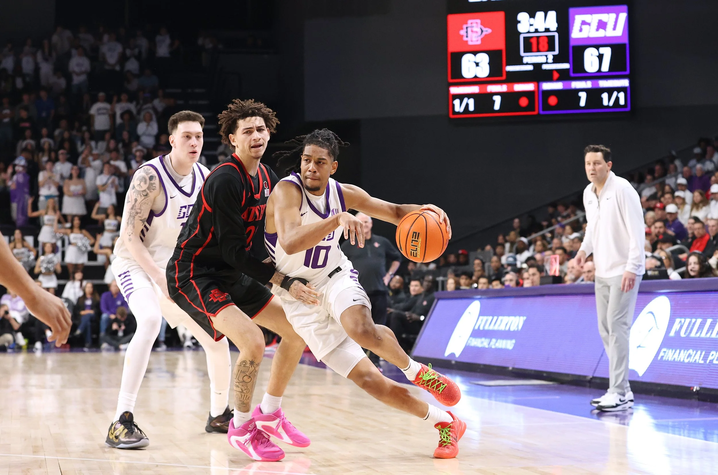 Grand Canyon’s Jaden Henley (10) drives around San Diego State’s Miles Bryd (21) in a Mountain West Conference matchup on January 21, 2026 at Global Credit Union Arena in Phoenix, Az. Photo: GCU Athletics