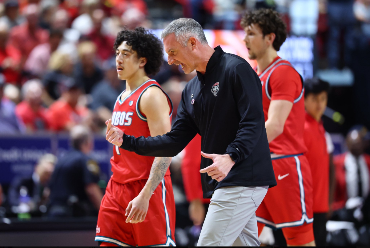 UNM men’s basketball coach Eric Olen instructs freshman guard Uriah Tenette during UNM’s Mountain West Conference Tournamnet Semi-Final loss to San Deigo State on Mar. 13, 2026. Photo: UNM Athletics